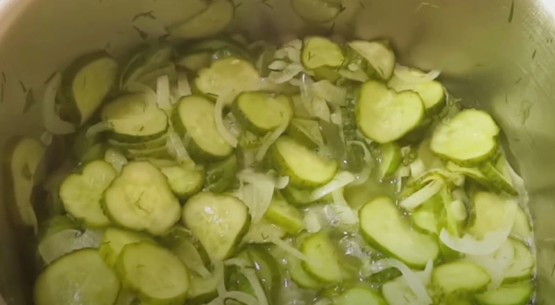 4. Спустя 2 часа вот столько много жидкости дали огурцы. Если вам кажется сока не достаточно, оставьте салат постоять еще на 1 час.