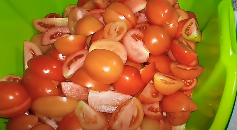 2. Томаты моем и выбираем самые красивые. Затем каждую штуку необходимо разрезать на 4 части или пополам, в зависимости от размера.