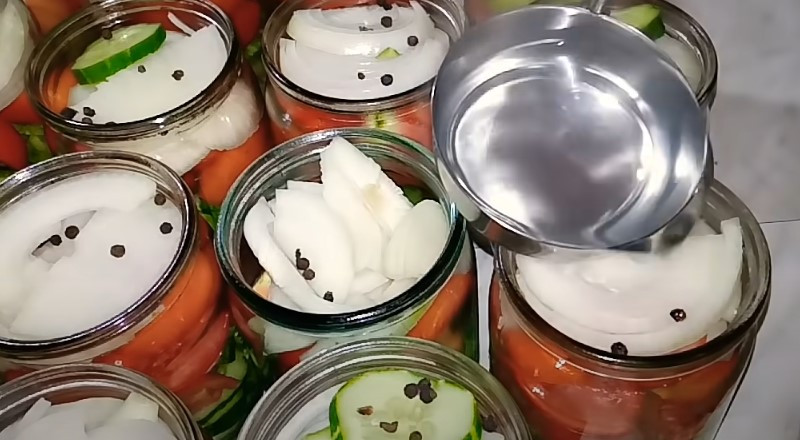 6. Готовый кипящий рассол заливаем в банки с овощами. Не забудьте сверху добавить 5-6 горошин черного перца.