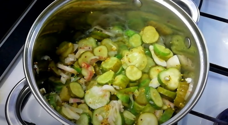 3. В глубокой кастрюле соединяем лук и огурцы. Затем к ним добавляем сахар, соль и горчицу. Все хорошо перемешиваем и даем постоять 2-3 часа.
