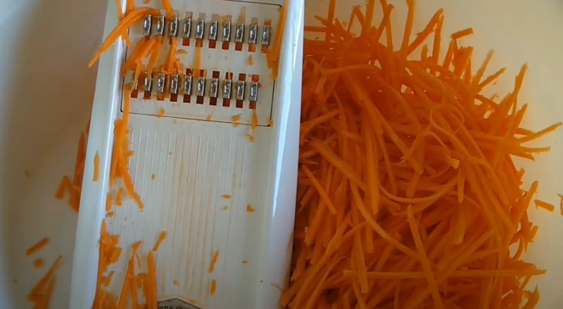 3. Морковь очищаем и натираем на терке для моркови по-корейски. Если такой нет, можно нарезать корнеплод тонкой соломкой.