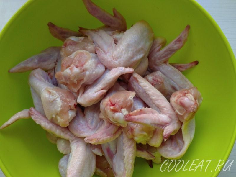 Шаг 1. В первую очередь нам необходимо подготовить сами крылышки. Я взяла охлажденное мясо, поэтому размораживать его перед приготовлением не потребовалось. Тщательно промываем всё под струей проточной воды, чтобы вымыть из продуктов ненужную кровь.