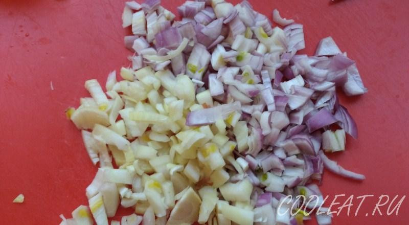 1. Для начала подготовим все овощи. Нарубим одну крупную белую луковицу, несколько зубчиков чеснока, а также стебель сельдерея. Нашинкуем на кубики свежую морковь.