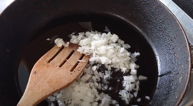 1. Для начала режем на мелкие кубики одну луковицу и сразу выкладываем овощ на сковороду с разогретым подсолнечным маслом. Обжариваем до появления золотистого оттенка.
