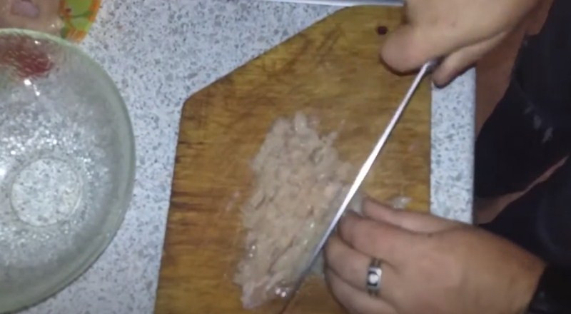2. Куриное филе нарезаем на тонкие слайсы, после этого рубим его на максимально тонкие кусочки. Должен получиться фарш крупной нарезки. Но если у вас есть мясорубка, можно использовать ее.