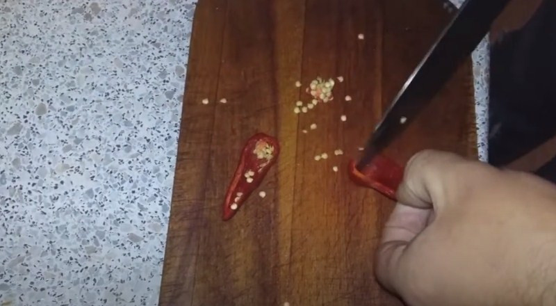 3. Перец чили режем на 2 части и тщательно вычищаем все семечки. Чтобы их устранить, можно промыть овощ под струей проточной воды. Мелко нашинкуем овощ и отправим к мясу.
