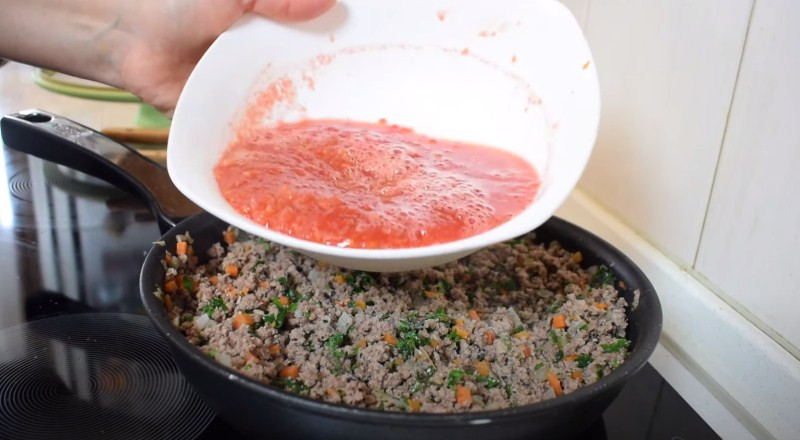 7. Когда все готово, можно всыпать петрушку и сушеный базилик. Все тщательно перемешиваем и отправляем туда заранее подготовленные перетертые помидоры. Тушим все на протяжении часа, чтобы фарш хорошо соединился со специями и помидорами.