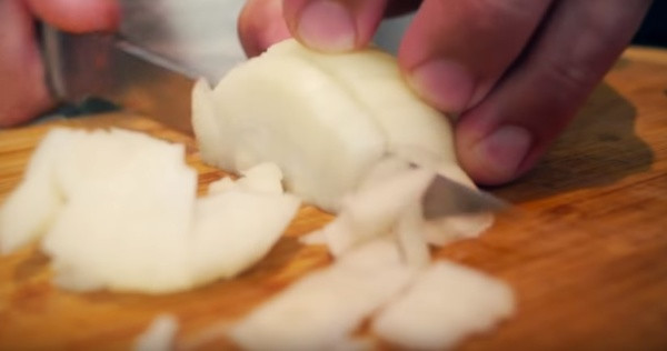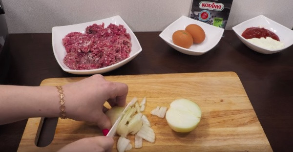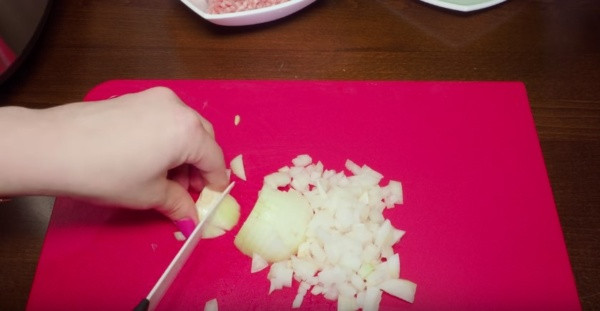 3. Мелко крошим лук и отправляем его к мясной составляющей.