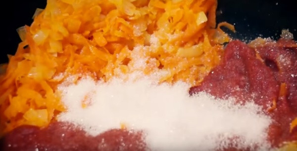 3. К остальным овощам отправляем томатную пасту, сахарим и солим по вкусу. Перемешиваем и продолжаем пассировать.