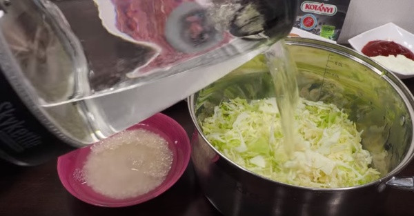 3. Рис и капусту заливаем крутым кипятком, и оставляем на 5-7 минут. Делаем мы это для того, чтобы капуста стала мягче, а рис разбух.