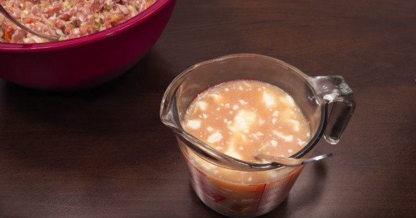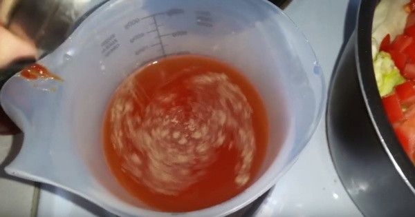 8. Нам осталось сделать заливку, для этого берём 500 мл воды, добавляем в неё томатную пасту, солим, перчим и перемешиваем до растворения всего содержимого.