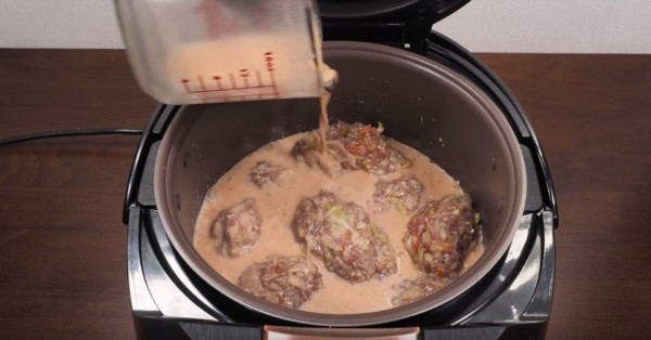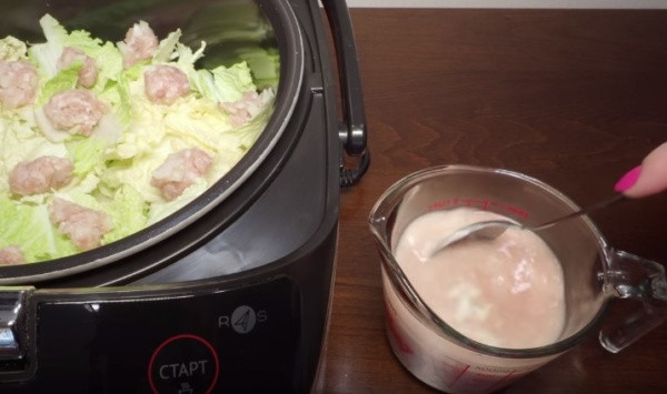 9. Поливаем нашей заливкой голубцы и прикрываем крышку мультиварки. Выставляем режим «тушение», в типе продуктов выбираем «овощи» и устанавливаем время 45 минут. Ожидаем пока приготовиться.