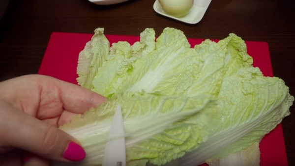 2. Разбираем пекинскую капусту на листки. Обратите внимание, листья, которые находятся ближе к сердцевине имеют более толстый край, поэтому с помощью ножа срежьте с него небольшой слой. Таким образом при заворачивании листья не поломаются. Заливаем их кипятком.