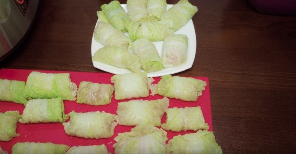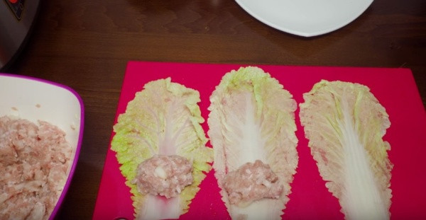 Заметьте, пекинская капуста более эластичная и даже если её не заливать кипятком, то листья всё равно не ломаются при скручивании.