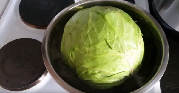 1. В первую очередь нам надо пропарить капусту, чтобы листья лучше отделялись от кочана. Чтобы это сделать возьмите кастрюлю и положите туда кочан, налейте воды по максимум и ставьте на плиту. Как только вода закипит с помощью двух вилок переворачивайте капусту, чтобы она ошпарилась со всех сторон. Делайте это на протяжении 5 минут.