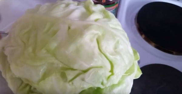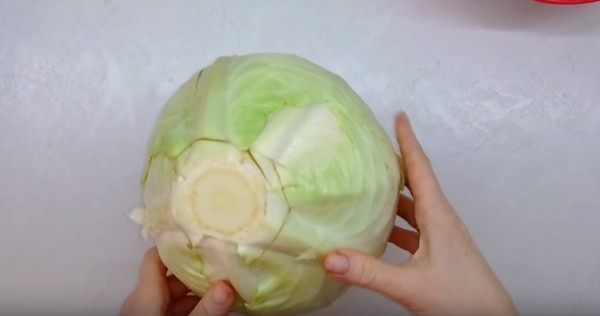 2. Берём кочан капусты и делаем в нём надрезы вдоль сердцевины. Ставим кипятиться воду и туда опускаем вилок. В процессе варки пробуйте отслаивать листья, сделать это можно с помощью двух вилок.