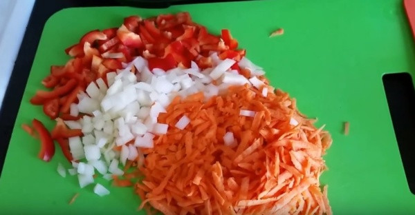 4. Перец, лук, чеснок и помидоры надо нарезать на небольшие кусочки. Трём морковь, а зелень мелко рубим.