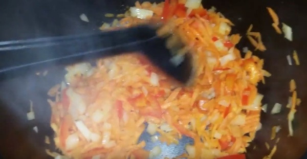 5. Теперь в чашу мультиварки-скороварки наливаем немного растительного масла и отправляем в неё нарезанный лук, морковь и перец. Обжариваем овощи в режиме «жарка» не более 2-х минут.