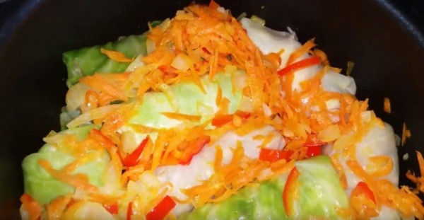 6. Половину всей пассировки отложите в отдельную миску. Остальную часть распределите по дну мультиварки-скороварки и выкладывайте на неё голубцы. На предпоследний слой выложите отложенную пассировку.