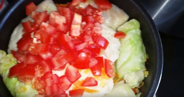 9. Поливаем нашей заливкой голубцы. Сверху помидор посыпьте зеленью и рубленным чесноком. Закрываем мультиварку-скороварку и выставляем на ней режим «тушение», выбираем тип продукта «птица». По времени ставим примерно 35 минут. Этого времени будет достаточно.