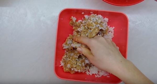 4. Рис варим и перемешиваем вместе с фаршем, если соли недостаточно, то добавьте.