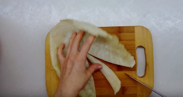 5. Отрезаем от листка капусты серединку, проделываем данную операцию со всеми листиками.