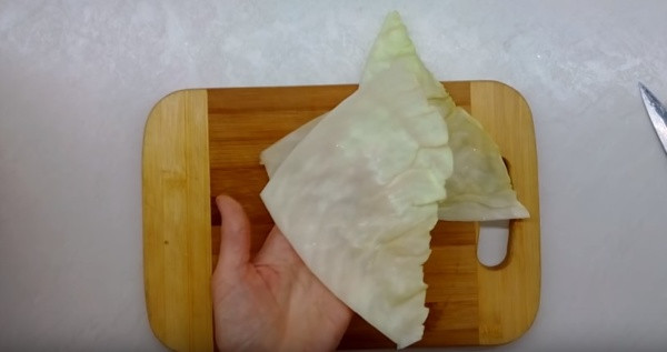 6. Теперь каждый капустный лист делим на 3 треугольные части. Это у нас будет такая особенная форма голубцов)