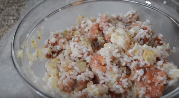 3. Чтобы сделать начинку, смешиваем с фаршем рис обжаренный лук (1 головку) и специи (соль, перец). Перемешиваем.