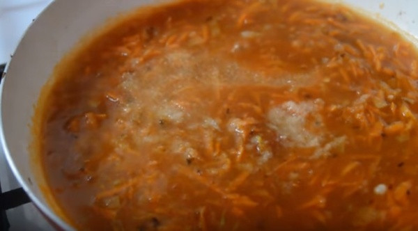 4. Теперь надо для заливки спассировать остальные овощи, такие как морковь и лук. Как только овощи обжарятся добавьте к ним муку (лучше её просеять), томатную пасту, соль и сахар. После залейте горячей водой. Оставляем всю смесь провариться примерно 5 минут.