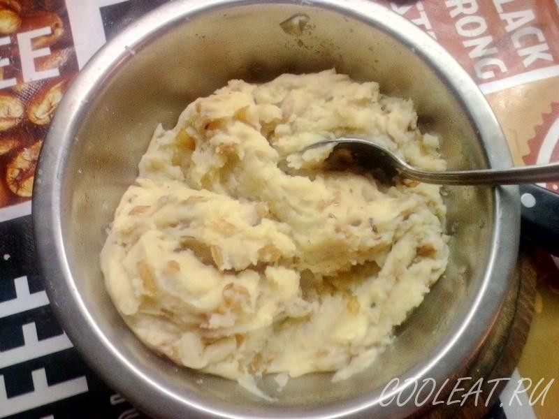 5. После всех процедур смешиваем обжаренный лук и толчёную картошку. Я ещё добавил молотого перца. Вы также обязательно попробуйте, что получилось и при необходимости подсолите или добавьте желаемого. Оставляем заготовку остывать.