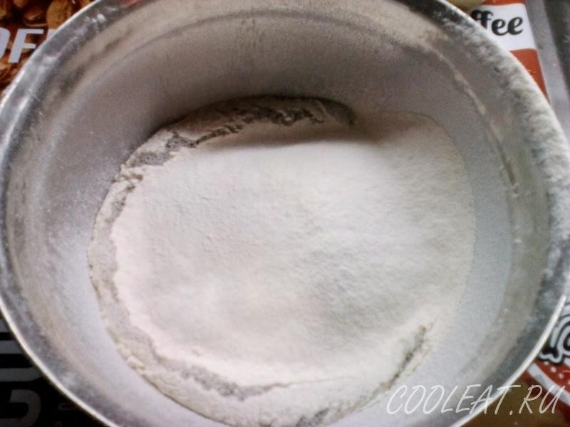 8. Начинаем просеивать мучную смесь. Говорят, что желательно брать муку высокого качества, с большим содержанием клейковины, однако я не особо заметил разницу между обычной и специальной. Вносить сухой продукт необходимо постепенно, вначале 1 стакан, потом второй и т. д. Вначале процесса всё замешиваем ложкой или лопаткой, до момента пока это не станет трудно делать.