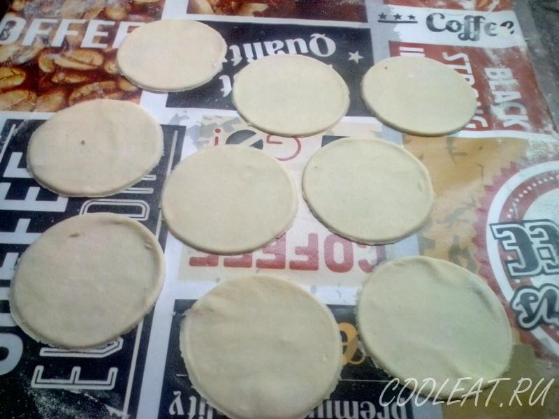 12. Раскатываем 1-ую часть в прямоугольник или круг, толщиной 3-4 мм. Тоньше не рекомендую, иначе при варке вареники порвутся. Также не забываем при раскатке переворачивать пласт, припыляя его мукой. В противном случае тесто прилипнет к столу и потом придётся всё начинать сначала. Когда пласт будет готов, берём стакан и выдавливаем им кругляшки. Оптимальный диаметр кружка 7,5 см, поэтому берите соответствующий бокал.