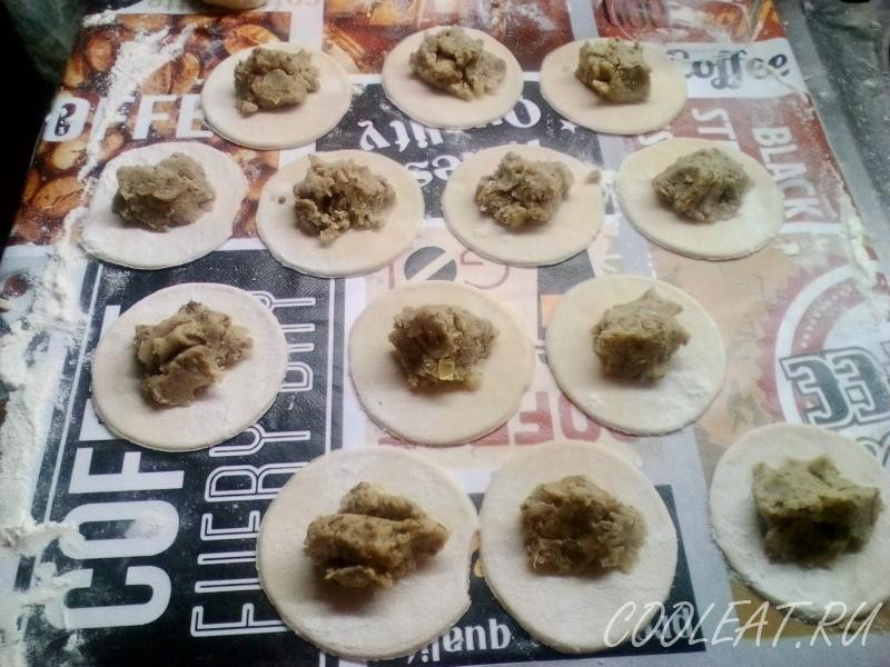 14. При помощи чайной ложки начинаем раскладывать начинку. Кладём столько, чтобы вареник в итоге можно было скрепить и наполнитель не вываливался (1 ч. л. с горкой хватит). Я вообще раскладывал всё руками, просто держал 1 большой кусок начинки в 1 руке, а другой отщипывал и ложил на середину кружочка. На фото я использовал другую начинку, но сути это не меняет.