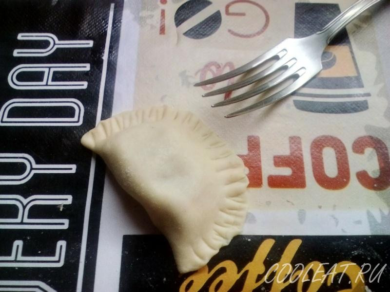 Шаг 2. Далее продолжаем скреплять края от середины к углу. Делаем все аккуратно и надёжно. Начинка не должна попадать на места креплений, иначе тесто не слепится между собой. В случае выпадания наполнителя пробуйте его протолкнуть мизинцем внутрь или просто уберите лишнюю часть.
