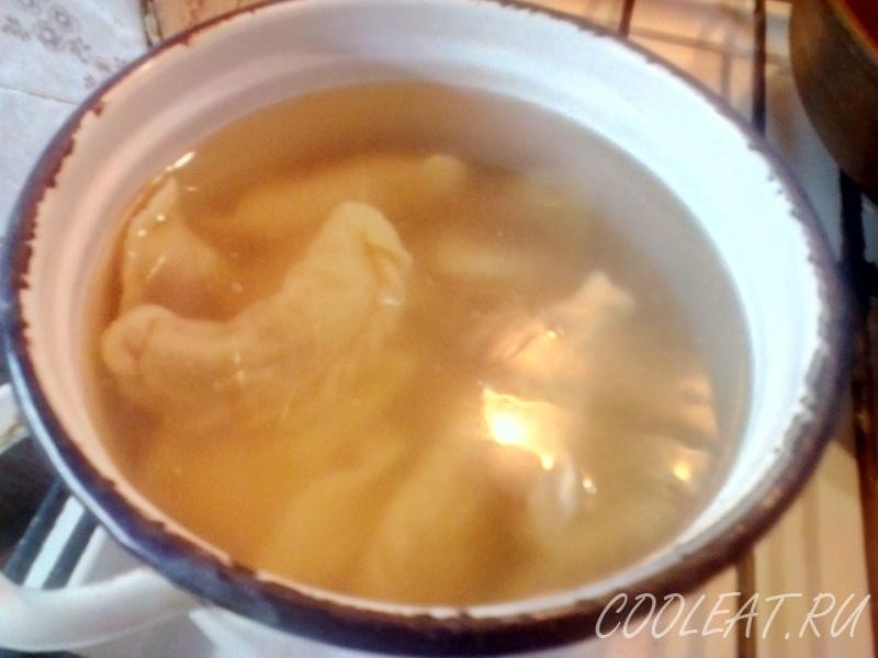 Шаг 2. После закипания начинаем закладывать полуфабрикаты, делаем это по 1 шт., но быстро, дабы тесто не успело прилипнуть ко дну. Следом аккуратно перемешиваем и ждём закипания.