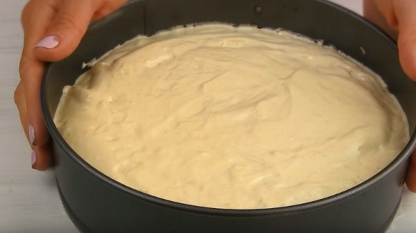 3. Застилаем дно разъёмной формы пергаментной бумагой и выливаем в неё тесто. Разравниваем.
