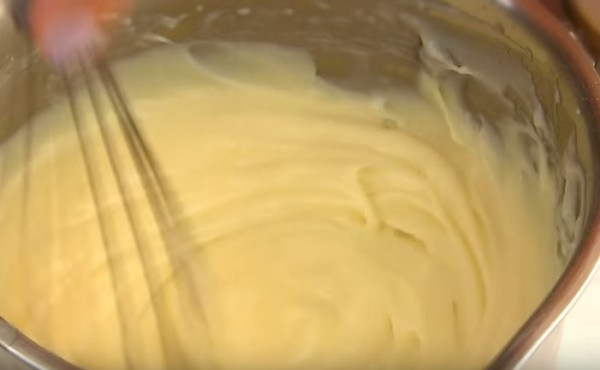 6. Вливаем половину молока, и отправляем сотейник на огонь, после вливаем оставшееся молоко и постоянно помешиваем крем, как только он загустеет, снимаем с плиты. К нему добавляем сливочное масло, перемешиваем. Накрываем его плёнкой и оставляем остывать.