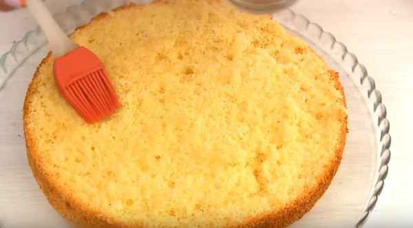 7. Корж делим на пополам, нижнюю часть пропитываем сиропом. Для этого смешайте 100 мл воды с 1 ст. л. сахара. Со вторым коржом поступаем аналогично.