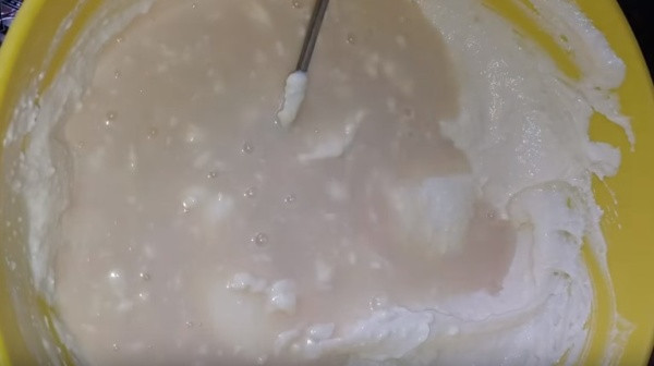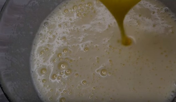 4. В тесто постепенно добавляем молоко и высыпаем разрыхлитель. Должно получиться тесто, чуть гуще чем на блинчики.