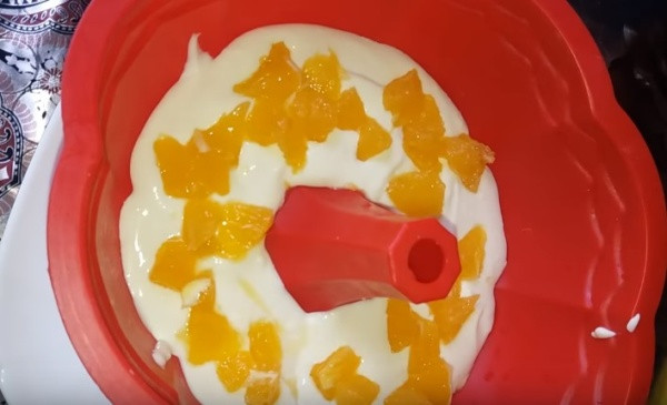 4. На дно формы выливаем часть творожной массы, сверху раскладываем порезанный апельсин. Далее его снова поливаем тестом и повторяем процесс ещё 1 раз.