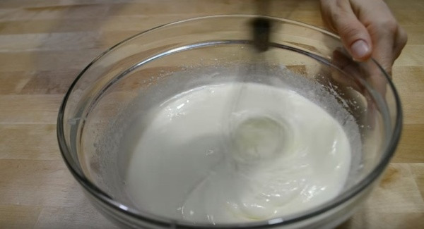 5. Готовим крем. Сметану перекладываем в миску к ней добавляем ванильный и обычный сахар, всё перемешиваем и взбиваем до того момента пока не раствориться весь сахар.
