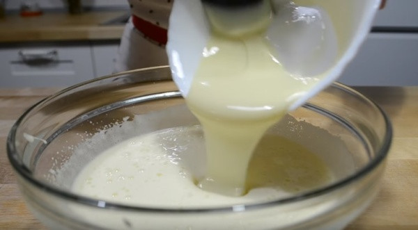 2. К яичной смеси отправляем сметану, смешиваем до однородности и потом добавляем сгущенное молоко, так же всё смешиваем.