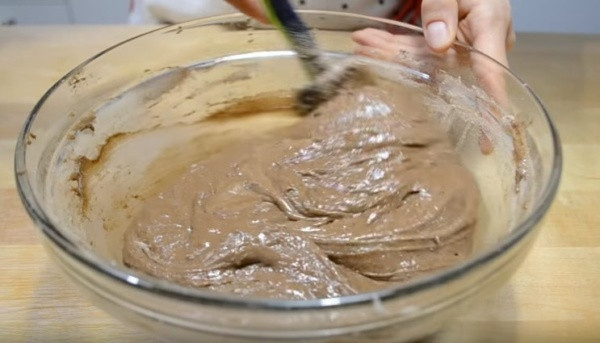 3. В муку высыпаем какао и разрыхлитель. Просеиваем сухую смесь в жидкую и перемешиваем до однородности.