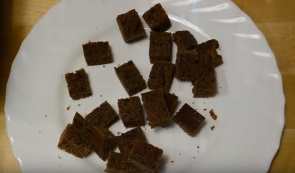 7. Остывший бисквит режем на 3 части (кольца), одну часть оставляем для основы, а остальные режем на небольшие квадратики.