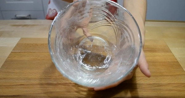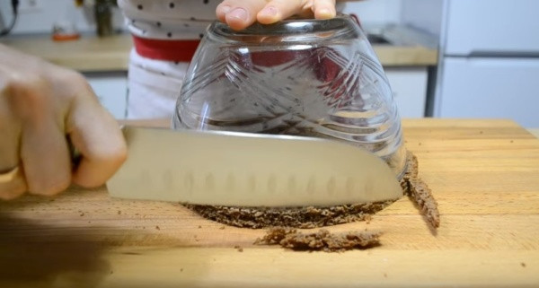 8. Основу для торта подгоняем под диаметр формы. Мы в качестве неё будем использовать 1,5 литровую стеклянную миску.