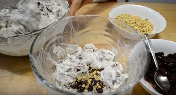 10. Сметанный крем смешиваем с нарезанным бисквитом. И теперь выкладываем часть этой массы на дно формы, далее делаем слой из вишен и орехов. Таким образом используем весь крем.