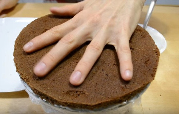 11. В конце тщательно промазываем вверх и кладём на него основу из бисквита.