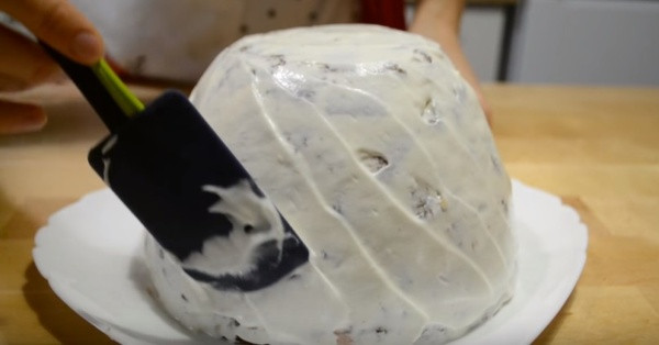 12. Переворачиваем торт, убираем с него миску и пищевую плёнку. Смазываем его кремом, который мы оставили.