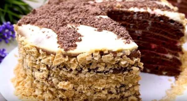 Бока торта посыпаем поломанными вафлями либо орехами, а вверх украшаем с помощью тёртого шоколада.