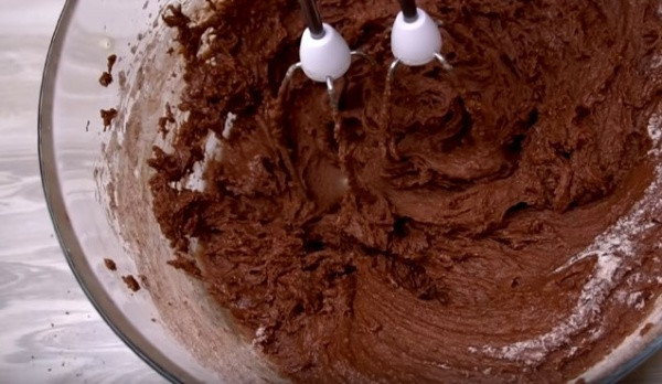 3. Муку смешиваем с какао и просеиваем к яйцам, взбиваем миксером.